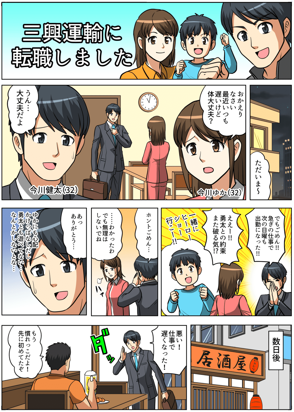 今川 健太:32歳。同い年の妻(ゆか)と3歳の子ども(勇太)がいる。現在の職場環境は残業が多く、ライフワークバランスが悪い。普通免許は持っているが、トラックの運転は未経験。